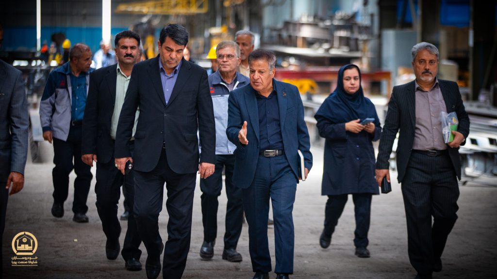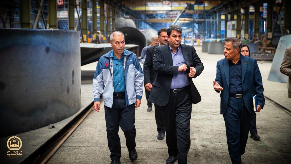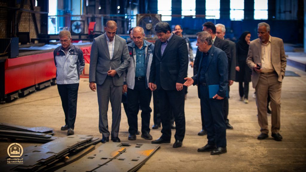 Governor Talebi and his accompanying delegation reviewed the facilities, ongoing projects, and capacities of the group’s subsidiaries. The visit began at Shokoufa Sanat Pouya, where several major industrial projects—including heavy steel structures and industrial equipment—were being manufactured by skilled engineers using advanced machinery.