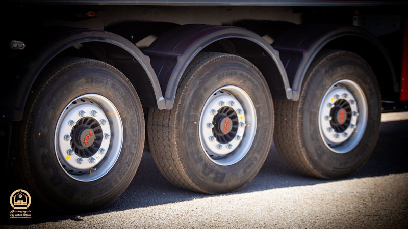 سه عدد محور FOX/SAF شاهنگی ، ظرفیت 9 تن (مجموع 27 تن)، محور جلو دارای بالابر اتوماتیک ، سیستم تعلیق بادی بالنی به همراه کمک های مخصوص، قابلیت تنظیم ارتفاع اتوماتیک و دستی با شیر سکو و مجهز به سیستم محدود کننده ارتفاع، در دو نوع دیسکی و کاسه ای